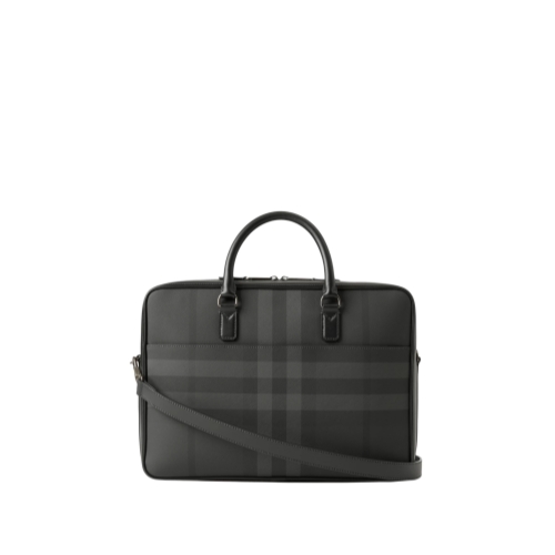 A structured briefcase made from a cotton blend patterned with the Burberry Check, lined in a solid colour. The design features calf leather trims and a detachable strap to switch from a handheld to a crossbody bag.