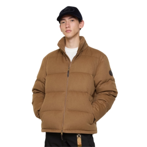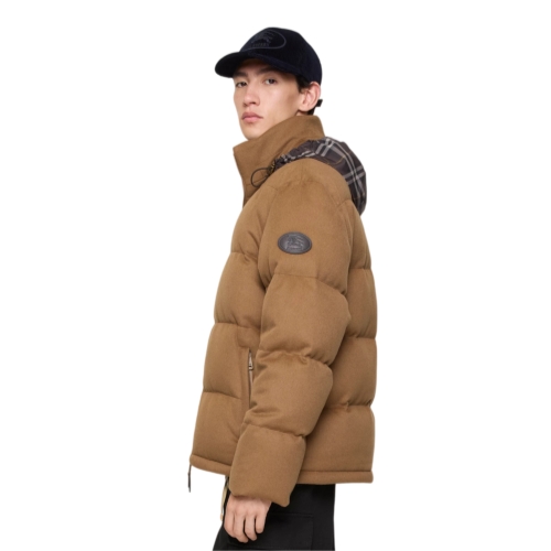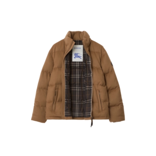 A funnel-neck puffer jacket in cashmere, brushed for a soft finish and filled with goose down and feathers. Cut to a relaxed fit, the Snowdon features a drawcord hem to adjust the shape and a Burberry Check packaway hood for unpredictable weather. The design is finished with a leather Knight stamp, an archival motif first used in the 1980s.