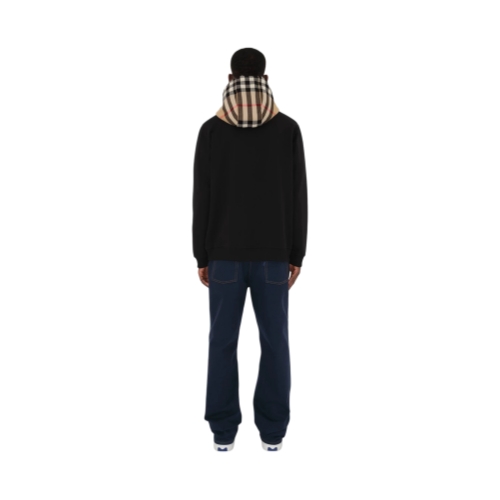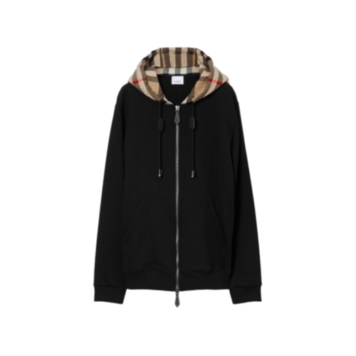 A zip hoodie in loop-back cotton jersey with a contrasting hood in Burberry Check cotton flannel. The design is cut to a relaxed fit and has calf leather trims.