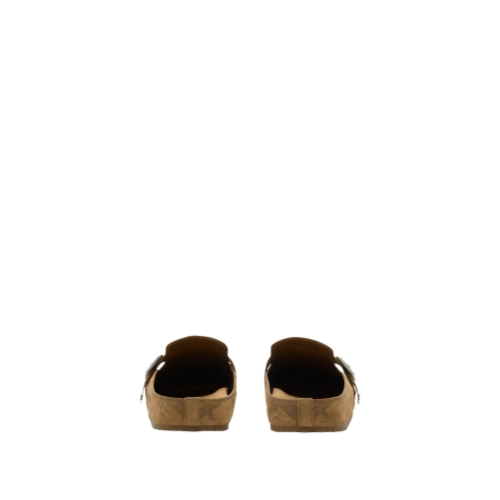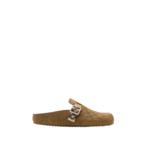 A pair of clogs crafted in Italy from soft suede embossed with a check pattern, set on a grooved sole moulded with archive Burberry lettering. The design is finished with an adjustable B buckle strap, jacquard-woven with the Burberry Check in our signature sand colourway.