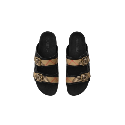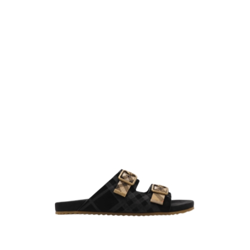 A pair of sandals crafted in Italy from soft suede embossed with a check pattern, set on a grooved sole moulded with archive Burberry lettering. The design is finished with adjustable B buckle straps, jacquard-woven with the Burberry Check in our signature sand beige colourway.