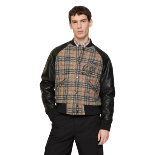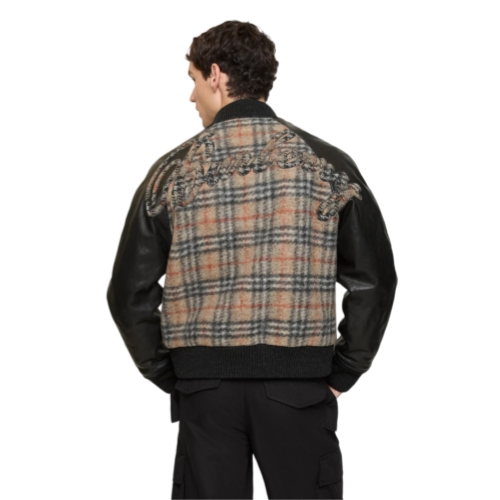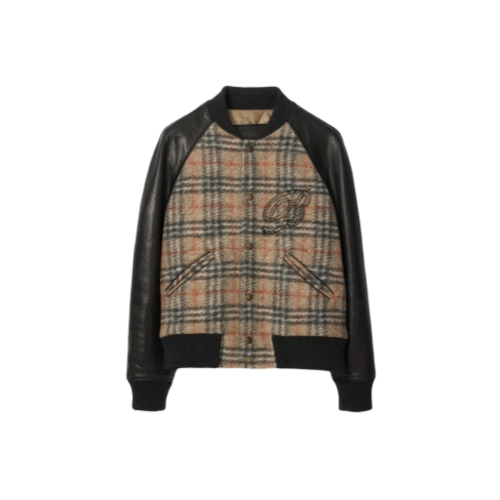 A bomber jacket in a wool blend jersey, knitted with the Burberry Check and brushed for a soft finish. The style features contrasting calf leather sleeves and is appliquéd with a cursive logo and 'B' motif. Our Equestrian Knight Design is quilted into the lining.