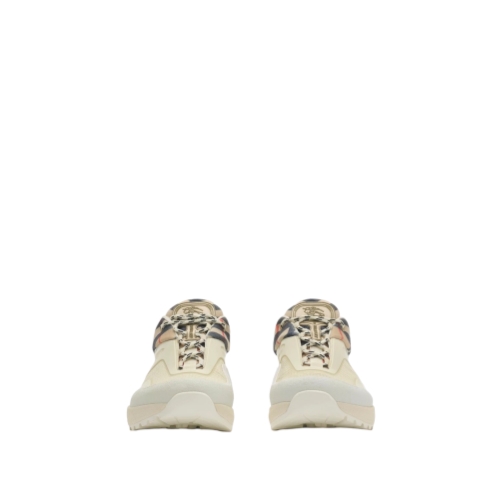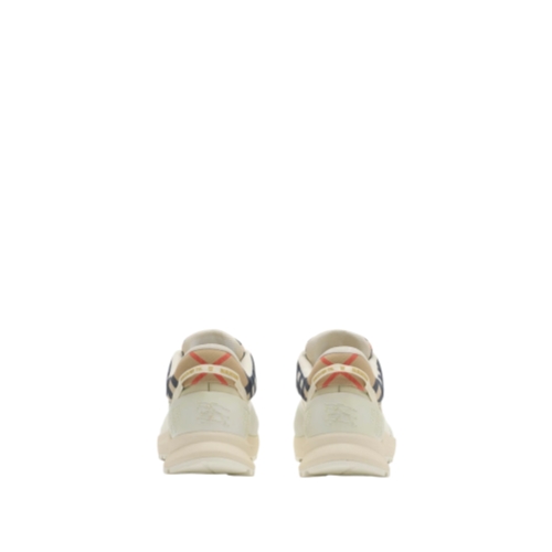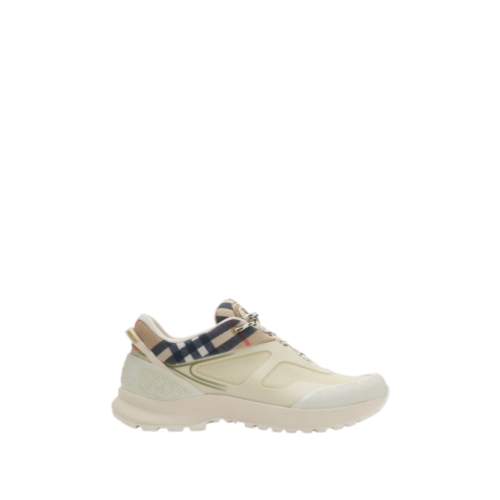 Inspired by hiking styles and our heritage of outdoor pursuits, the Discover sneakers are crafted in contrasting textures with mesh panels and a knitted cuff in sand beige Burberry Check. The style is finished with two-tone laces, a tonal Equestrian Knight Design appliqué and a heel strap with a raised logo print.