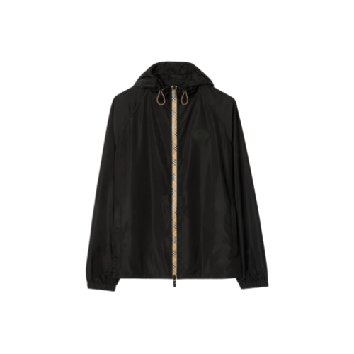 A hooded jacket woven in nylon, finished with Burberry Check taping and B-cut zip pulls. The lightweight style is cut to a relaxed fit and appliquéd with our Knight stamp – an archival motif first seen on Burberry bags in the 1980s.