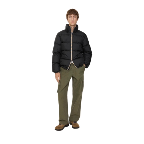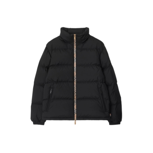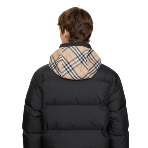 A puffer jacket filled with goose down and feathers, with Burberry Check taping at the front zip and a packaway hood in our signature sand colourway. The style is cut to a relaxed fit and appliquéd with our Knight stamp – an archival motif from the 1980s.