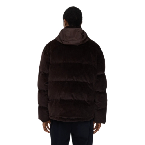 A puffer jacket made from cotton corduroy, filled with goose down and feathers. The style is lined in Burberry Check cotton in a truffle brown colourway and features an appliquéd leather Knight stamp – an archival motif first seen on Burberry bags in the 1980s. Cut to a relaxed fit with a packaway nylon hood for unpredictable weather.