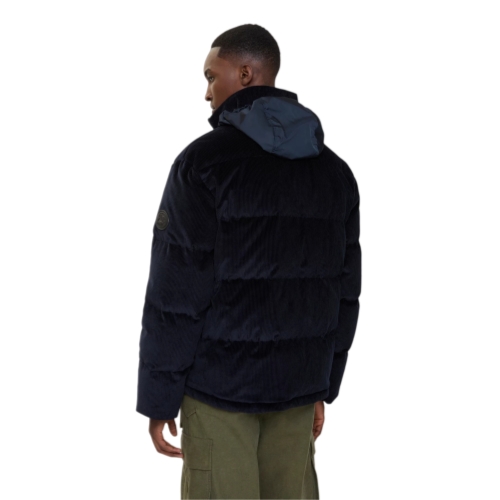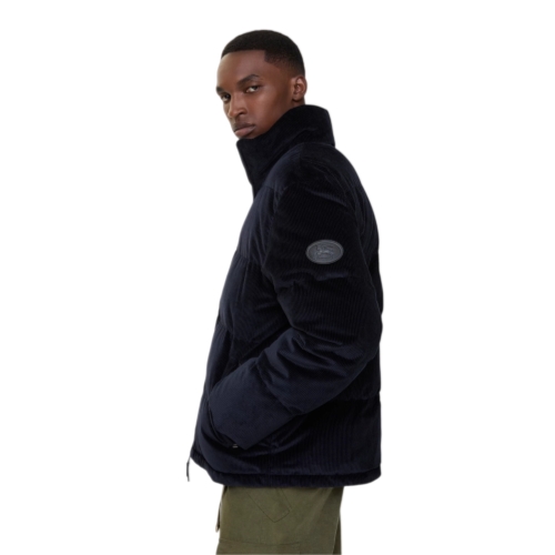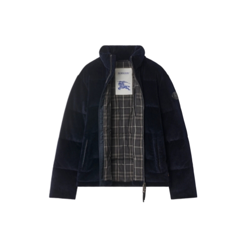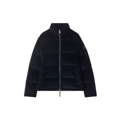 A puffer jacket made from cotton corduroy, filled with goose down and feathers. The style is lined in Burberry Check cotton in a graphite grey colourway and features an appliquéd leather Knight stamp – an archival motif first seen on Burberry bags in the 1980s. Cut to a relaxed fit with a packaway nylon hood for unpredictable weather.