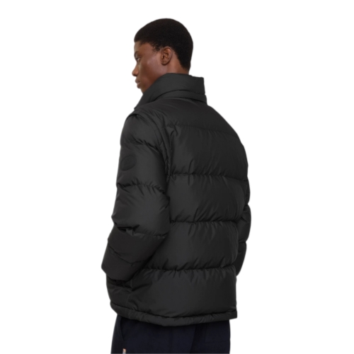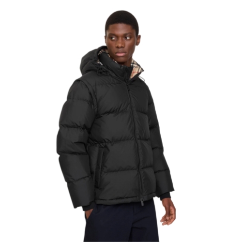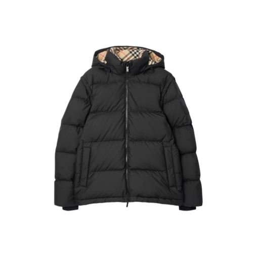 A puffer jacket filled with goose down and insulating fibres, appliquéd with our Knight stamp – an archival motif from the 1980s. Detachable sleeves switch the design from a jacket to a gilet. The style is cut to a relaxed fit and features a Burberry Check wool lining at the detachable hood and collar.