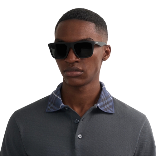 A pair of square-frame sunglasses made in Italy from tortoiseshell nylon, subtly embossed with a check pattern. The temples are printed with the Burberry logo.
