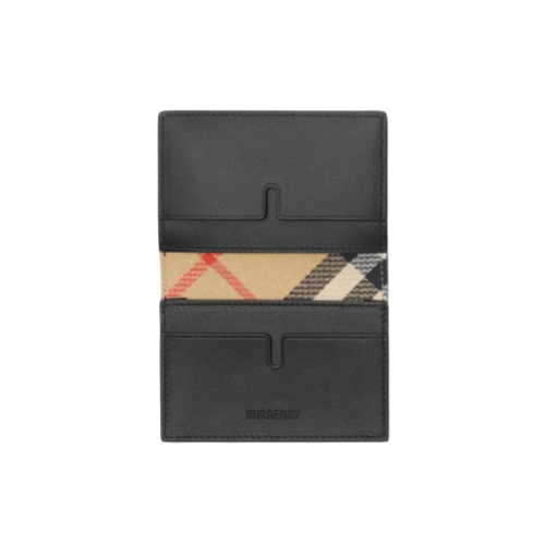 A folding card case made from grainy calf leather with a partial Burberry Check lining in our signature sand colourway. The design is finished with an enamelled Knight stamp plaque, an archival motif first seen on Burberry bags in the 1980s.