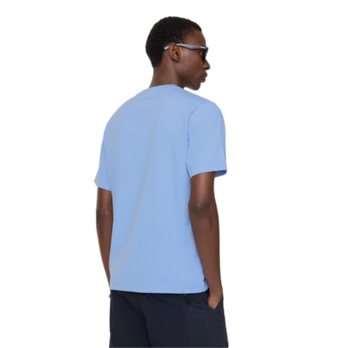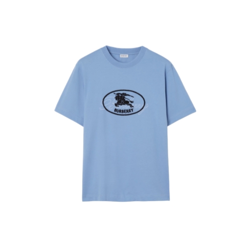 A T-shirt made from cotton jersey, cut to a regular fit. The crew-neck style features a flocked logo print overlaid with our Knight stamp in chain-stitch embroidery – the archival motif was first seen on Burberry bags in the 1980s.