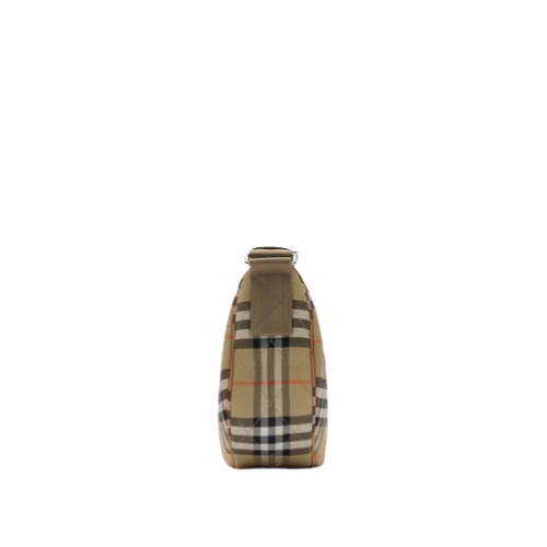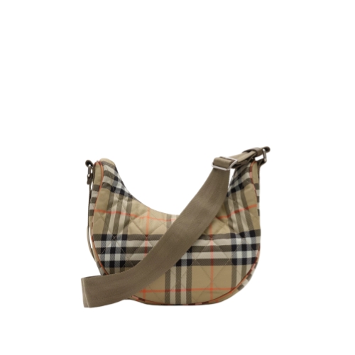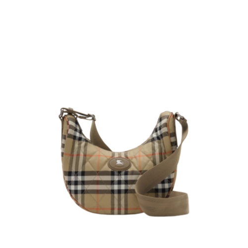 Inspired by country pursuits, a crossbody bag made from quilted nylon woven with the Burberry Check in signature sand beige. The Horseshoe design features tonal leather trims and our Knight stamp, an archival motif first seen on Burberry bags in the 1980s. Switch from a shoulder to a crossbody bag using the adjustable webbing strap.