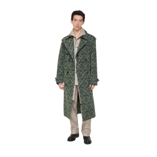 Debuted on the Burberry Winter 2025 runway, a trench coat tailored from a lightweight viscose blend and printed with a Baroque-style pattern inspired by the exquisite, faded interiors of British stately homes. A relaxed fit and raglan construction give a softer line at the shoulders, while an archival trench inspires the curlicue shape of the pockets. Adjust the shape with the B buckle belt.