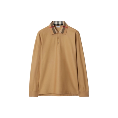 A long-sleeved polo shirt in cotton piqué, topped with a knitted Burberry Check collar. The design is cut to a slim fit.