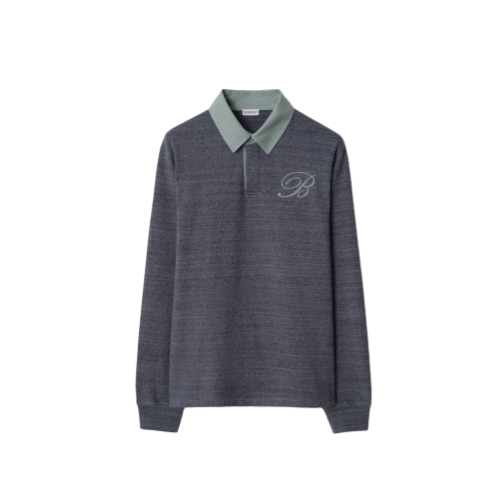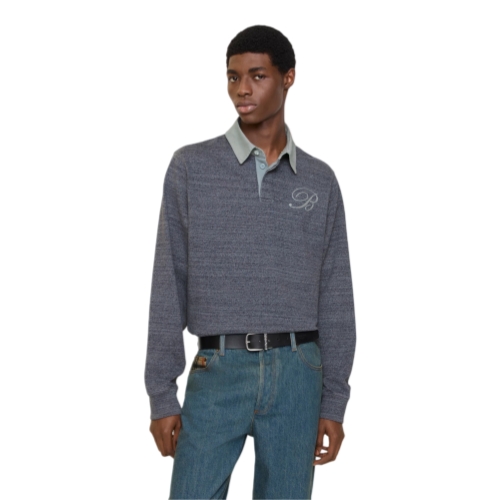 A long-sleeved rugby shirt in mouliné cotton jersey, cut to a relaxed fit. The design is detailed with a contrasting collar, concealed button placket, and a cursive-style embroidered initial.