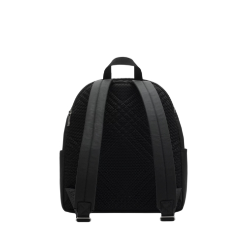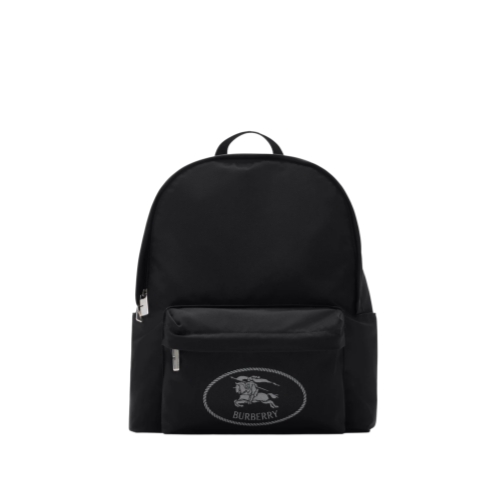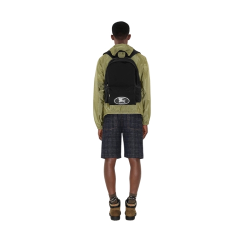 A backpack woven with a fil coupé Knight stamp in a reflective yarn, lined in a matching colour. The archival motif was first seen on Burberry bags in the 1980s. At the back is a breathable mesh panel with an exterior zip compartment to secure a laptop.