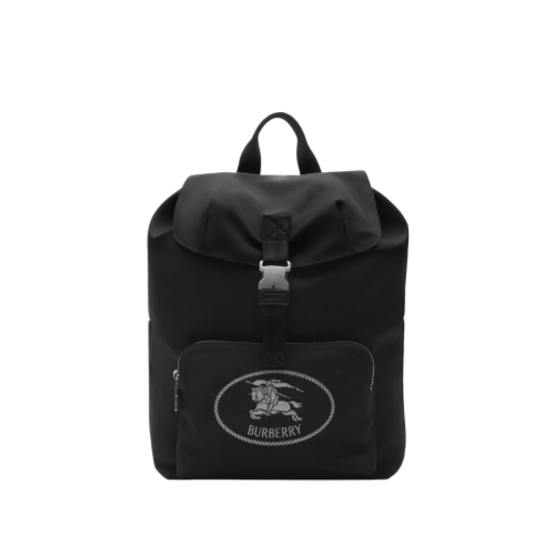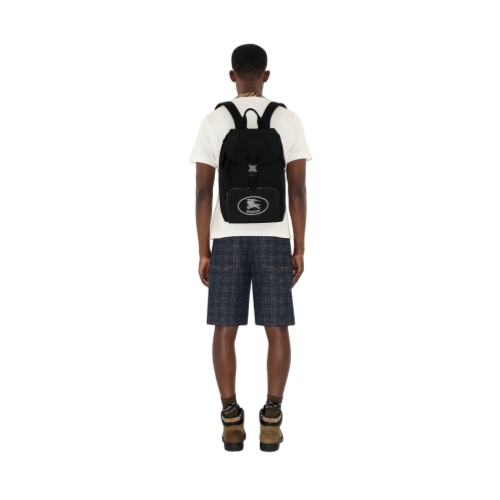 A backpack woven with a fil coupé Knight stamp in a reflective yarn, lined in a matching colour. The archival motif was first seen on Burberry bags in the 1980s. The clip closure is engraved with our logo and B-cut zip pulls secure the pockets.