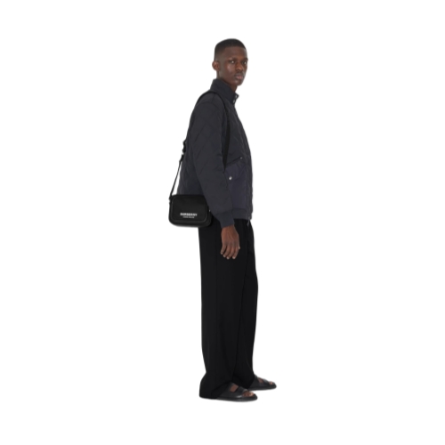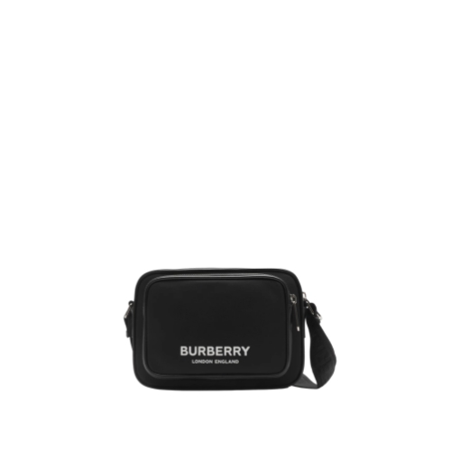A crossbody bag in nylon printed with raised Burberry lettering and lined in a matching material. The compact style is trimmed with leather and features an adjustable strap with a jacquard-woven logo.