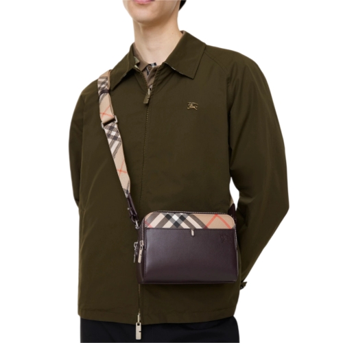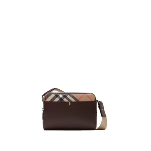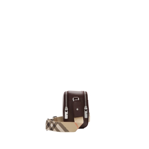 A compact crossbody bag made from calf leather with a pop of Burberry Check in signature sand beige. The style features an adjustable strap and is finished with an embossed Equestrian Knight Design.