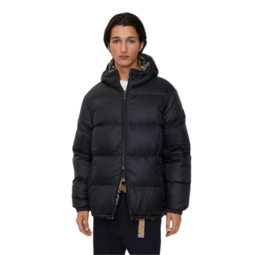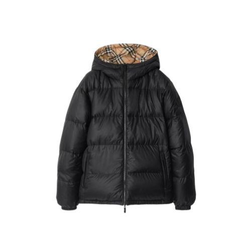 A hooded puffer jacket filled with goose down and feathers, cut to a relaxed fit. The reversible design switches from Burberry Check to a solid colour nylon and is appliquéd with our Knight stamp, an archival motif first seen on Burberry bags in the 1980s.