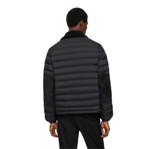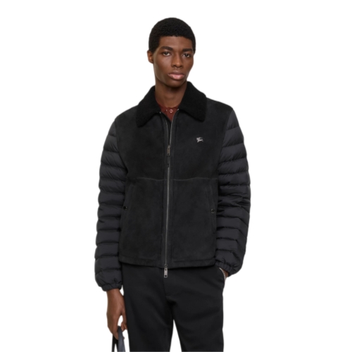 A fusion of signature Burberry outerwear, this hybrid puffer jacket combines plush shearling with lightweight nylon. The style is cut to a regular fit and filled with goose down and feathers. A contrasting suede front panel features the Equestrian Knight Design in an antique metal finish – a direct nod to the materiality of protective armour.
