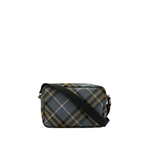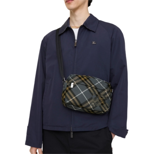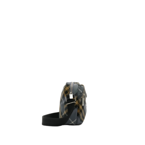 A compact crossbody bag woven with the Burberry Check in seasonal wave blue, appliquéd with a matching Equestrian Knight Design. The lightweight style features B-cut zip pulls and an exterior pocket for small items.
