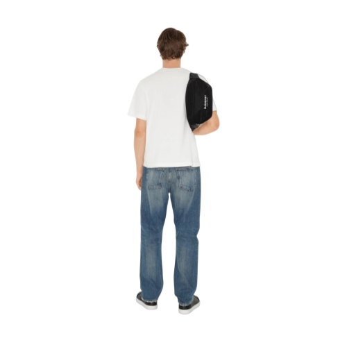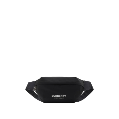 A belt bag in nylon printed with raised Burberry lettering and lined in a matching material. The style is trimmed in leather and features a jacquard-woven logo strap to adjust the design from a crossbody bag to wear around the waist.