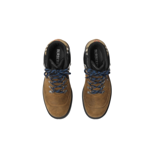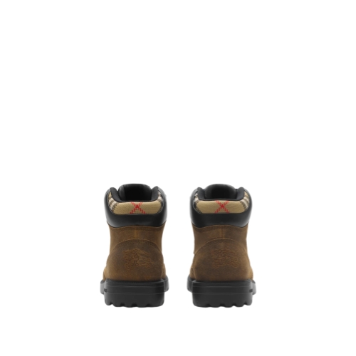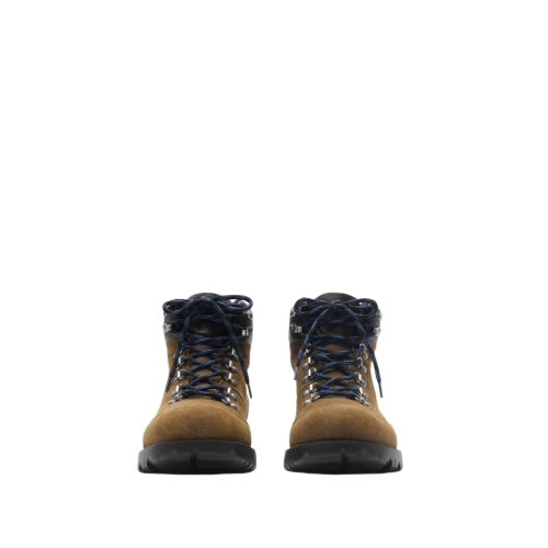 Hiking-inspired boots made in Italy from suede, set on a lightweight sole. The padded leather collar features a knitted Burberry Check insert in our signature sand colourway. Our Equestrian Knight Design is embroidered at the back and the laces are detailed with Knight Blue stripes.