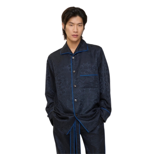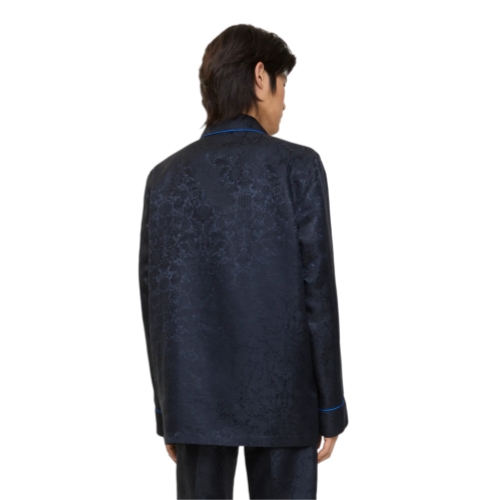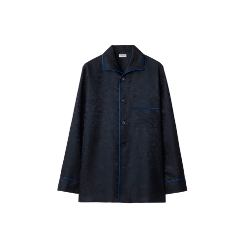 A pyjama shirt made in Italy from silk, jacquard-woven with William Morris’ 'Sunflower' artwork – a wallpaper design from 1879 (©Victoria and Albert Museum, London). Debuted on the Burberry Winter 2025 runway, the style is tailored to an oversized fit and trimmed with blue piping.