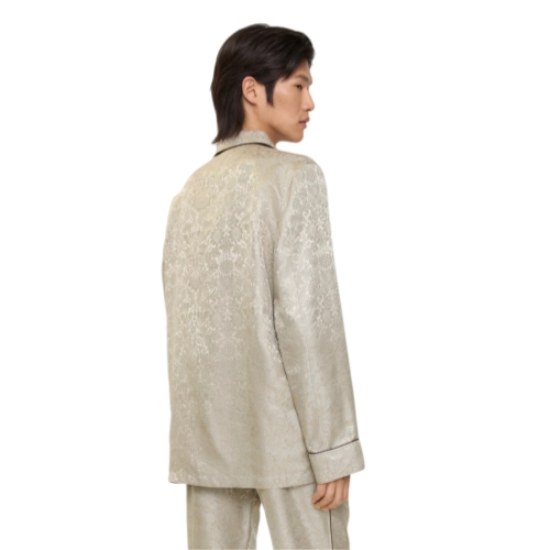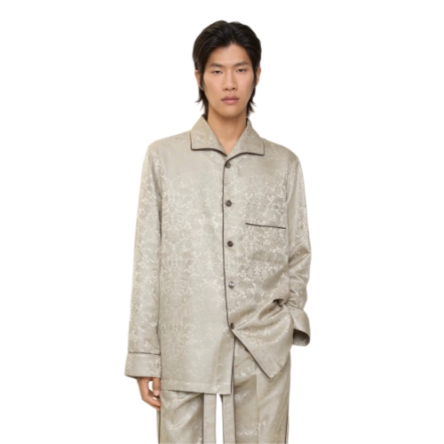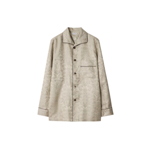 A pyjama shirt made in Italy from silk, jacquard-woven with William Morris’ 'Sunflower' artwork – a wallpaper design from 1879 (©Victoria and Albert Museum, London). Debuted on the Burberry Winter 2025 runway, the style is tailored to an oversized fit and trimmed with brown piping.