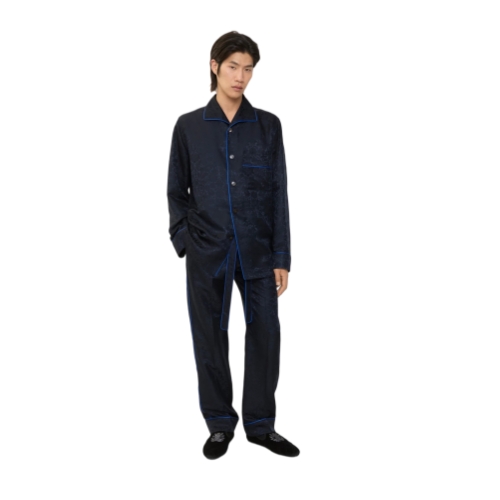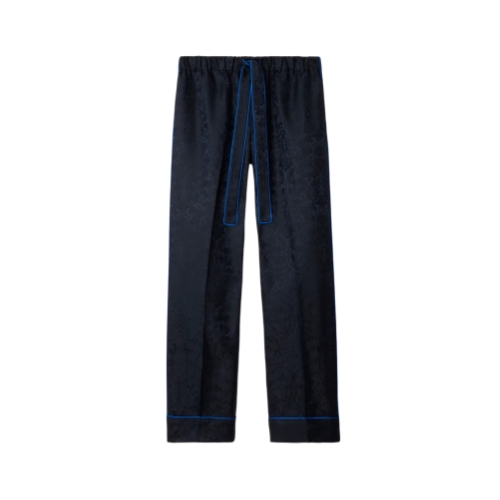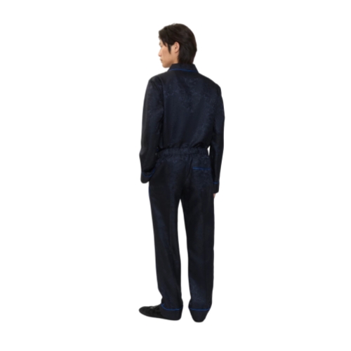 Pyjama trousers made in Italy from silk, jacquard-woven with William Morris’ ‘Sunflower’ artwork – a wallpaper design from 1879 (©Victoria and Albert Museum, London). Debuted on the Burberry Winter 2025 runway, the style is tailored to a regular fit and features a drawcord belt trimmed with blue piping.