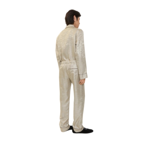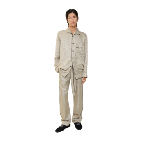 Pyjama trousers made in Italy from silk, jacquard-woven with William Morris’ ‘Sunflower’ artwork – a wallpaper design from 1879 (©Victoria and Albert Museum, London). Debuted on the Burberry Winter 2025 runway, the style is tailored to a regular fit and features a drawcord belt trimmed with brown piping.