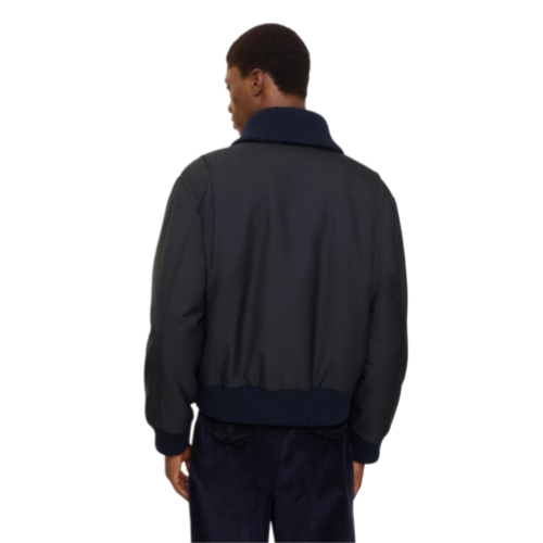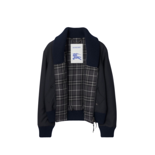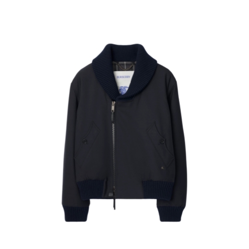 A lightly padded bomber jacket made from wool blend twill, topped with a chunky knitted collar. The style is cut to a relaxed fit with a Burberry Check cotton lining and leather-trimmed zip pulls. An archival trench inspires the curlicue shape of the pockets.