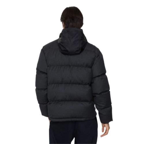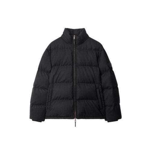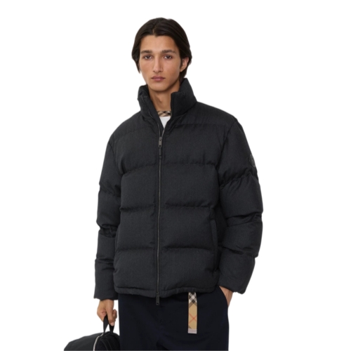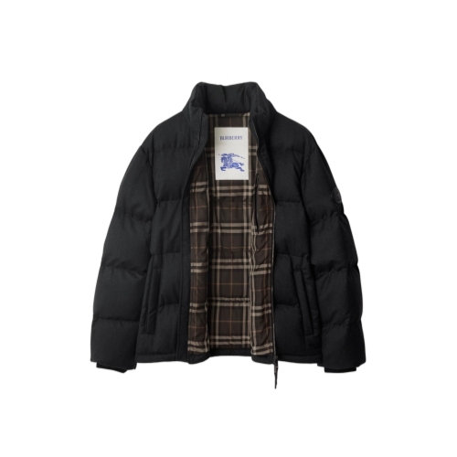A puffer jacket made from lightweight wool flannel, filled with goose down and feathers. The style is lined in Burberry Check cotton in a truffle brown colourway and features an appliquéd leather Knight stamp – an archival motif first seen on Burberry bags in the 1980s. Cut to a relaxed fit with a packaway nylon hood for unpredictable weather.
