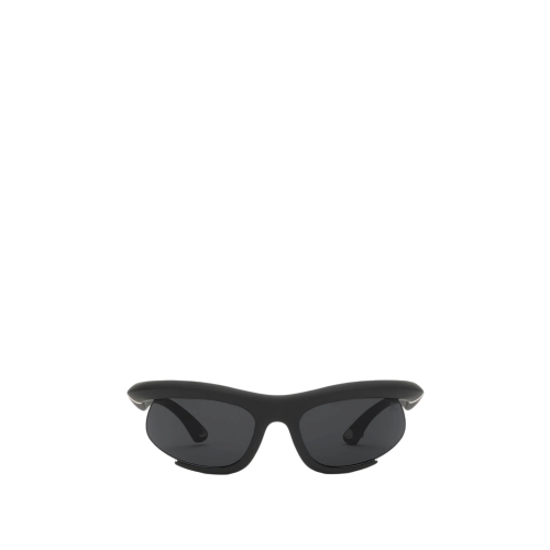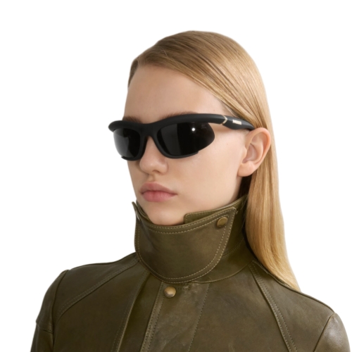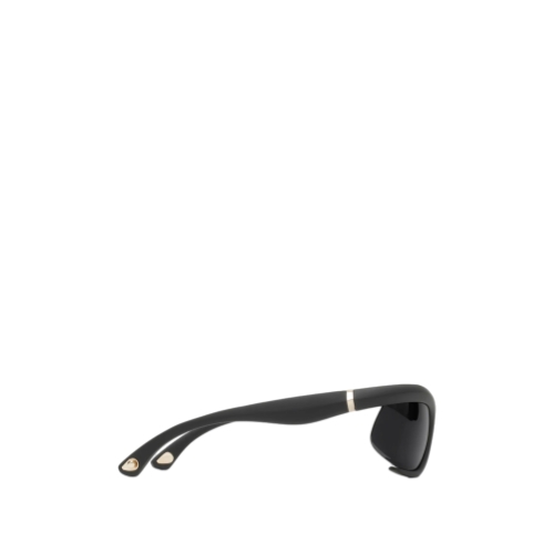 A pair of curved wrap-around sunglasses made in Italy from injected nylon. The sporty style features a metal shield at the temple tip to attach the adjustable strap.
