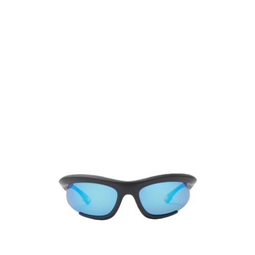 A pair of curved wrap-around sunglasses made in Italy from injected nylon. The sporty style features a metal shield at the temple tip to attach the adjustable strap.