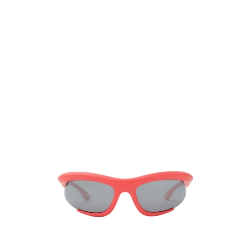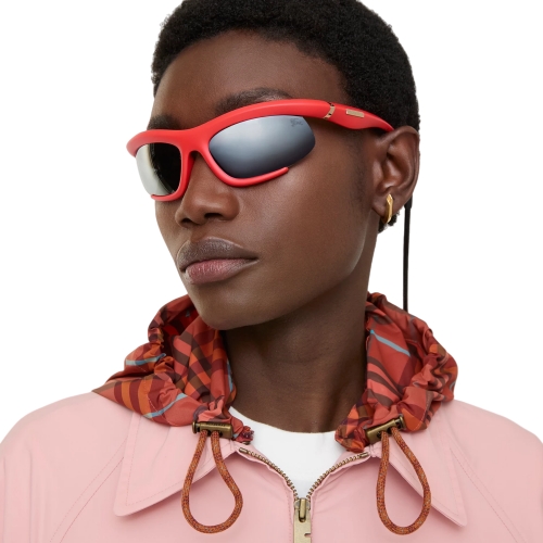 A pair of curved wrap-around sunglasses made in Italy from injected nylon. The sporty style features a metal shield at the temple tip to attach the adjustable strap.