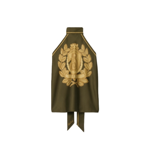 A halterneck silhouette crafted in Italy from silk twill scarves, printed with a logo crest. Inspired by an archival design, it features our B shield, a garland of oak leaves and a banner with the date Burberry was founded.