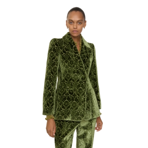 A blazer made in Italy from jacquard-woven velvet damask, debuted on the Burberry Winter 2025 runway. The intricate raised fabric evokes the rococo-style flocked wallpapers found in British stately homes. Tailored to a slim fit and lined with satin.
