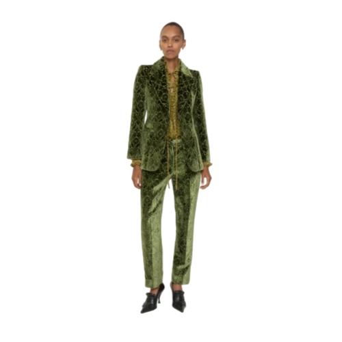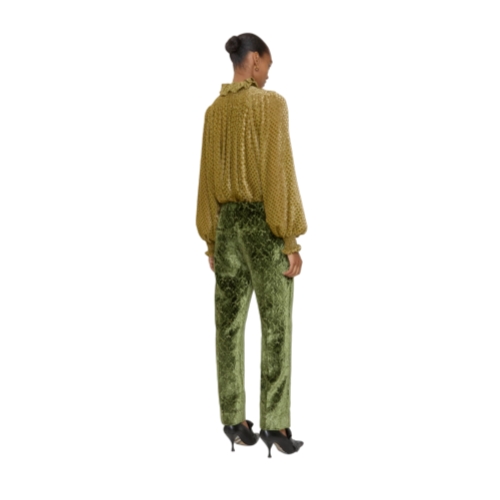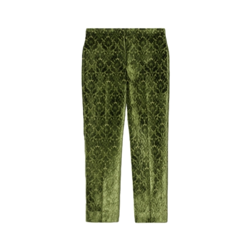Trousers made in Italy from jacquard-woven velvet damask, debuted on the Burberry Winter 2025 runway. The intricate raised fabric evokes the rococo-style flocked wallpapers found in British stately homes. Tailored to a slim fit with a mid-rise waist, the silhouette is cropped to the ankle.