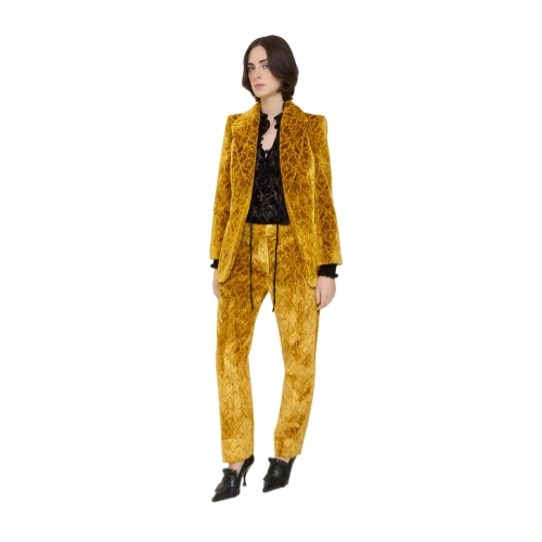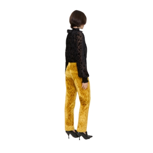 Trousers made in Italy from jacquard-woven velvet damask, debuted on the Burberry Winter 2025 runway. The intricate raised fabric evokes the rococo-style flocked wallpapers found in British stately homes. Tailored to a slim fit with a mid-rise waist, the silhouette is cropped to the ankle.