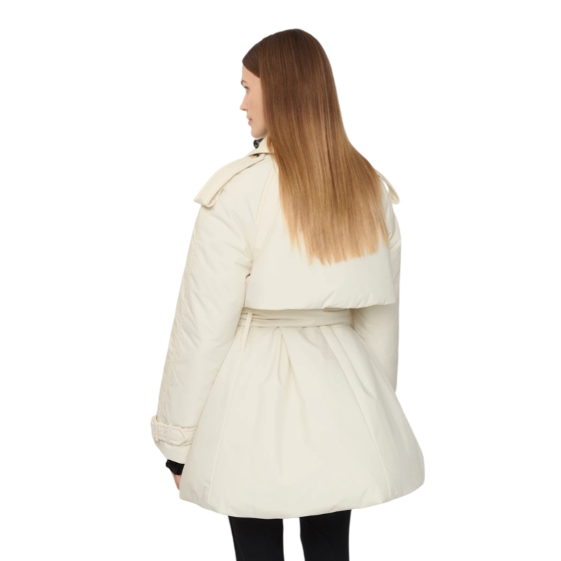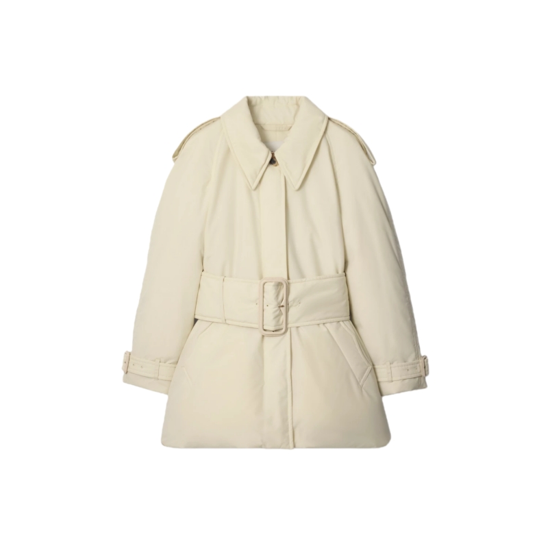 Reimagining our signature rainwear, the Berryhill car coat is cut to a shorter length and padded with goose down and feathers. Shaped with wide sleeves and a fuller skirt, the relaxed silhouette features an oversized belt to emphasise the waist. The undercollar is embroidered with a tonal check pattern and the curlicue shape of the pockets is inspired by an archival trench.