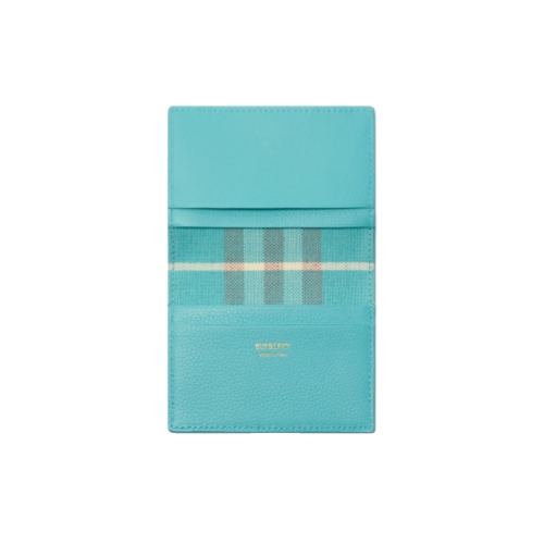 A slim folding card case made in Italy from grainy calf leather, lined with a Burberry Check cotton linen blend in a seasonal atom blue colourway. The Bloomsbury collection is finished with a leather and metal Knight stamp, an archival motif first seen on Burberry bags in the 1980s.