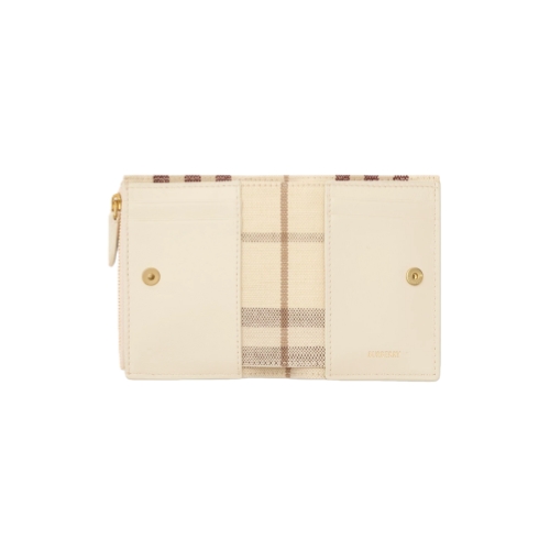 A slim wallet made from grainy calf leather, lined with a Burberry Check cotton linen blend in light beige. The Bloomsbury collection is finished with a leather and metal Knight stamp, an archival motif first seen on Burberry bags in the 1980s.