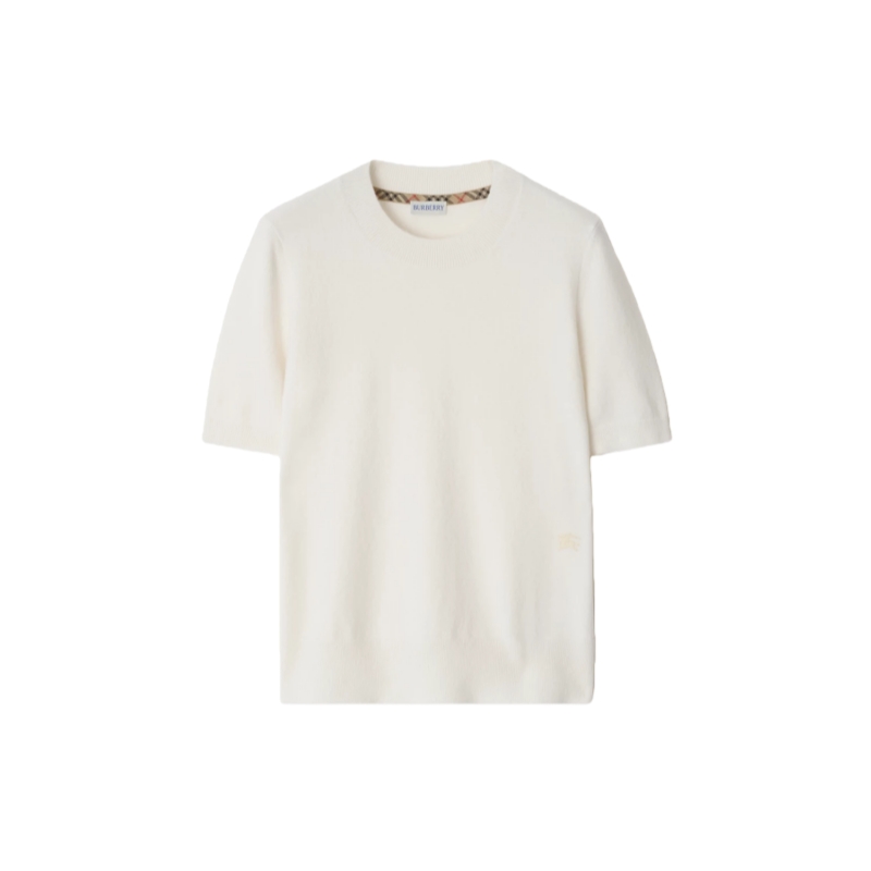 A short-sleeved top in cashmere blend jersey, knitted to a regular fit. The lightweight style features an embroidered Equestrian Knight Design and is lined at the collar with Burberry Check.