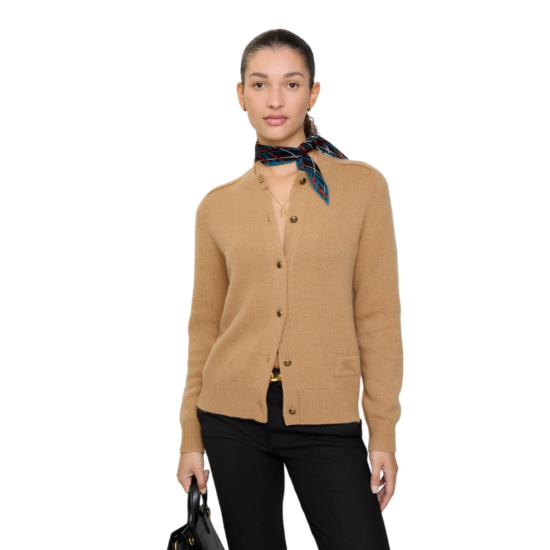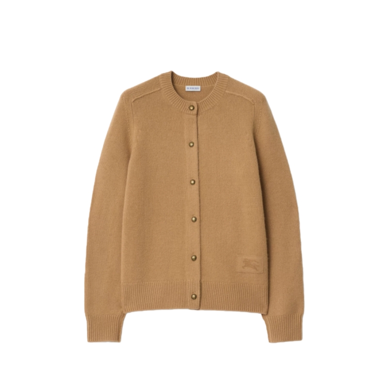 A crew-neck cardigan made from ultra-soft cashmere with a hint of stretch. Cut to a regular fit, the style is knitted with tonal elbow patches, chain-stitching at the shoulders and a contrasting Equestrian Knight Design. The domed buttons have an antique finish and feature our B crest flanked by a pair of unicorns – inspired by an archive emblem found on Thomas Burberry’s personal silverware.