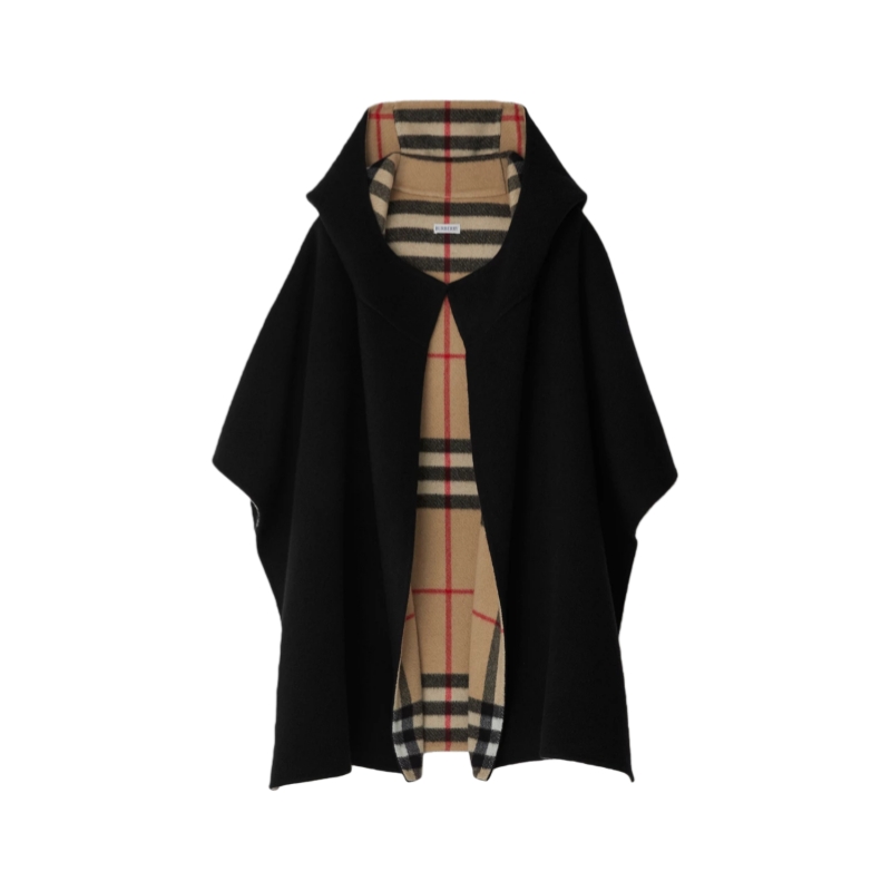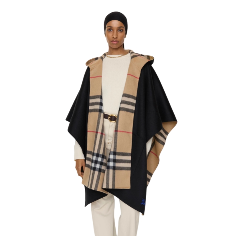 A hooded cape in cashmere, embroidered with a tonal Equestrian Knight Design. Made at a Scottish mill founded in 1797, the fabric is washed in local spring water and brushed for a soft finish. The inner is woven with Burberry Check in signature archive beige.