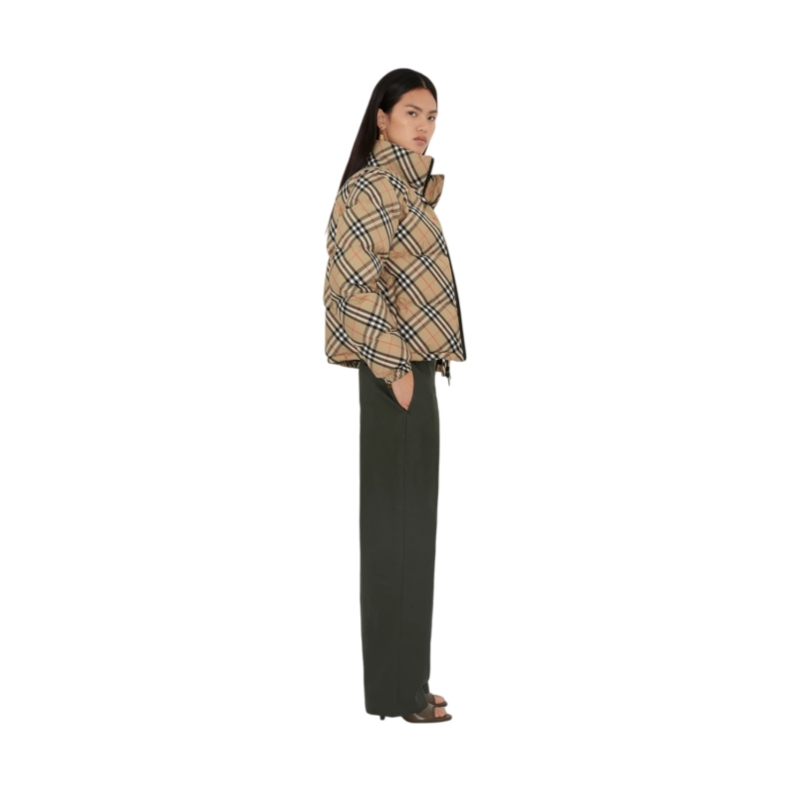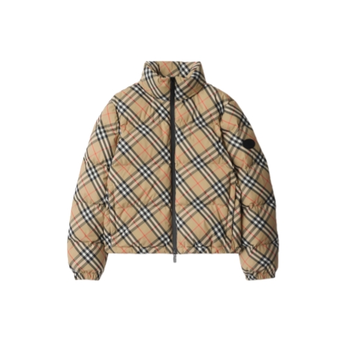 A puffer jacket in Burberry Check, cut to a regular fit with B-cut zip pulls. The Ambleside features a packaway hood and a Knight stamp appliqué, an archival motif from the 1980s.