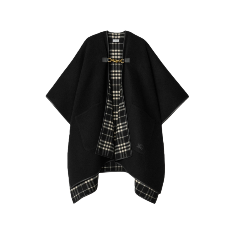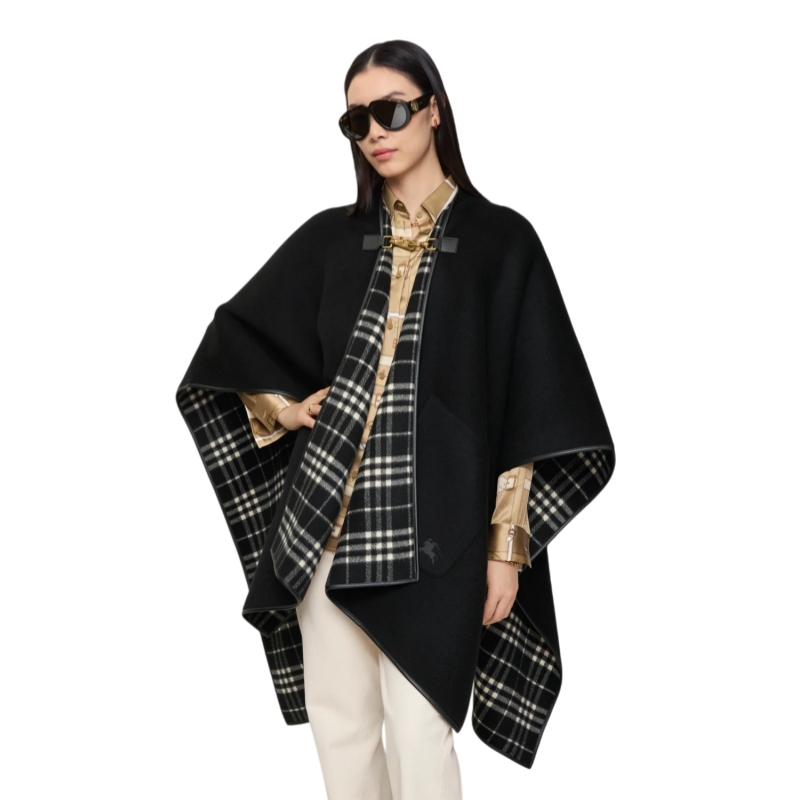 A cape made in Italy from super-soft double-faced cashmere, woven with a Burberry Check inner and edged with smooth calf leather piping. The style is secured by a horse-shaped clip with an antique finish, inspired by our Equestrian Knight Design.