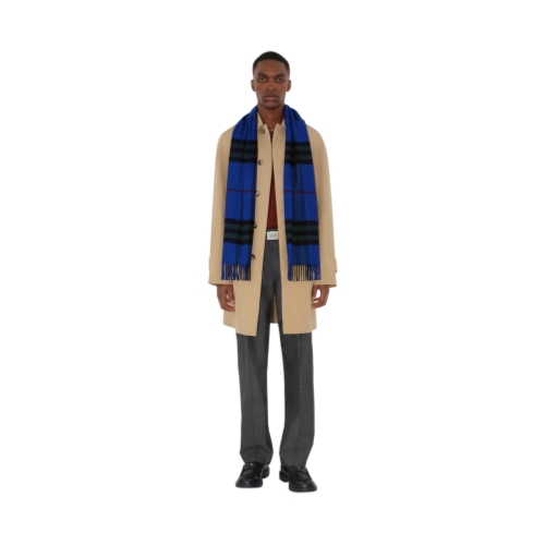 The iconic Burberry Check cashmere scarf, made in Scotland at a mill founded in 1797. Woven on traditional looms, the scarf takes more than 30 steps to complete. The fabric is washed in local spring water and brushed with teasels – dried flowers that are drawn along the surface of the cashmere to 'raise' the cloth, creating a natural lustre and ultra-soft finish.